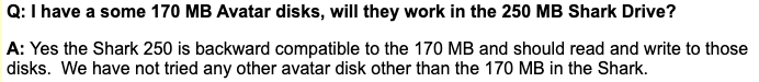 Q: I have a some 170 MB Avatar disks, will they work in the 250 MB Shark Drive?