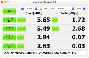 ddalong with comparable cards for context. The write command isdd if=/dev/random of=/dev/rdisk4 count=8192, and the read command isdd if=/dev/rdisk4 of=/dev/null. Test system us MacOS 12.6 with a “Genesys Logic” USB2.0 CF reader