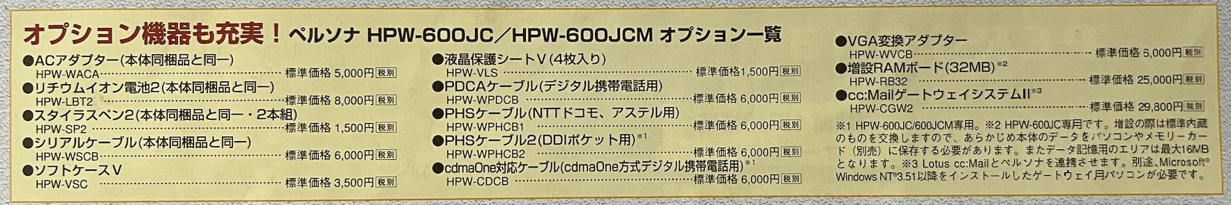 ※1 HPW-600JC/600JCM専用。※2 HPW-600JC専用です。増設の際は標準内蔵のものを交換しますので、あらかじめ本体のデータをパソコンやメモリーカード(別売)に保存する必要があります。またデータ記憶用のエリアは最大16MBとなります。※3 Lotus cc:Mallとペルソナを連携させます。別途、Microsoft Windows NT 3.51以降をインストールしたゲートウェイ月パソコンが必要です。