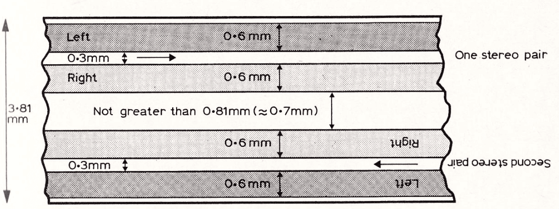 For STEREO AUDIO cassette, each mono track is divided in to separate tracks of 0.6mm wide with a guard band of 0.3mm.